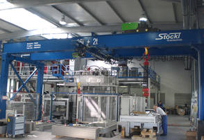 Ein Vollportalkran mit Windwerk sorgt in Giessereien für Arbeitserleichterung. Ein solcher Giessereikran hebt hier schwere Formen in die Becken. Das Stöckl- Windwerk zeichnet sich durch seine massive Bauart aus.